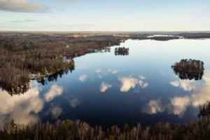 Sjö, SkogEn solig sommardag lyfte en drönare från Osbysjöns lugna vatten och rörde sig långsamt inåt land, över vass och trädtoppar,